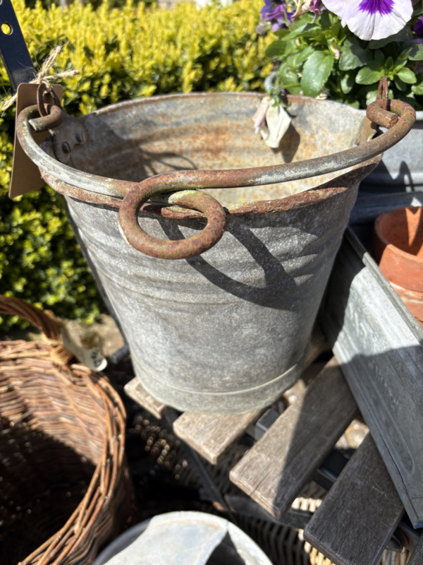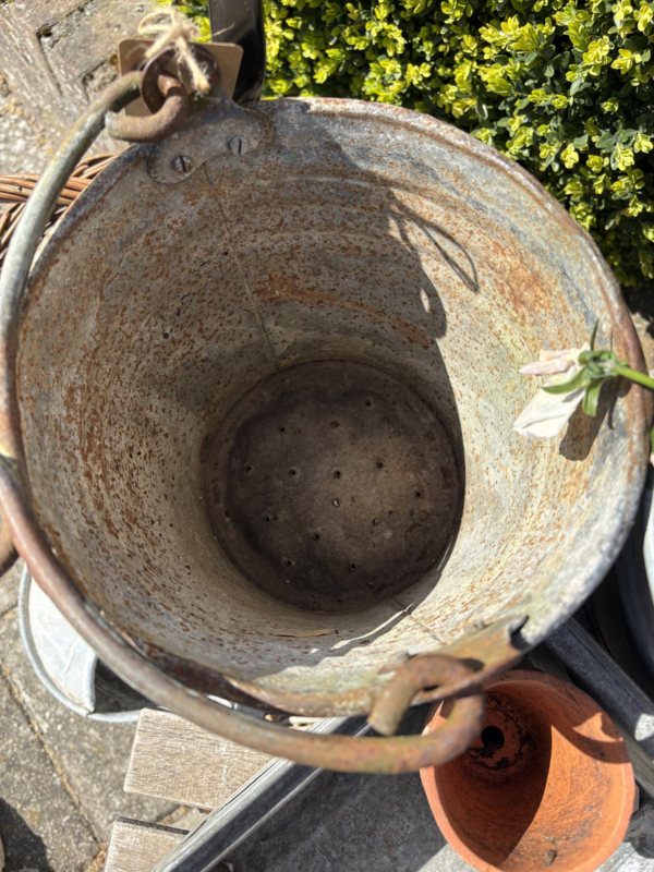Een zinken putemmer met gaatjes in de bodem. Je kunt hem nu ophangen in een boom of aan pergola met een vrolijke hangplant erin.